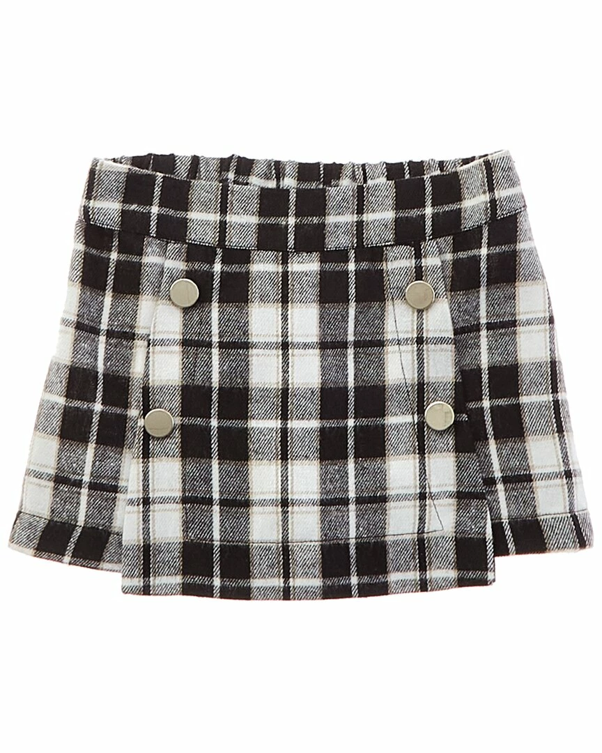 - Plaid Skort In Black Combo With Elasticized Waist And Layered Front With Faux Buttons