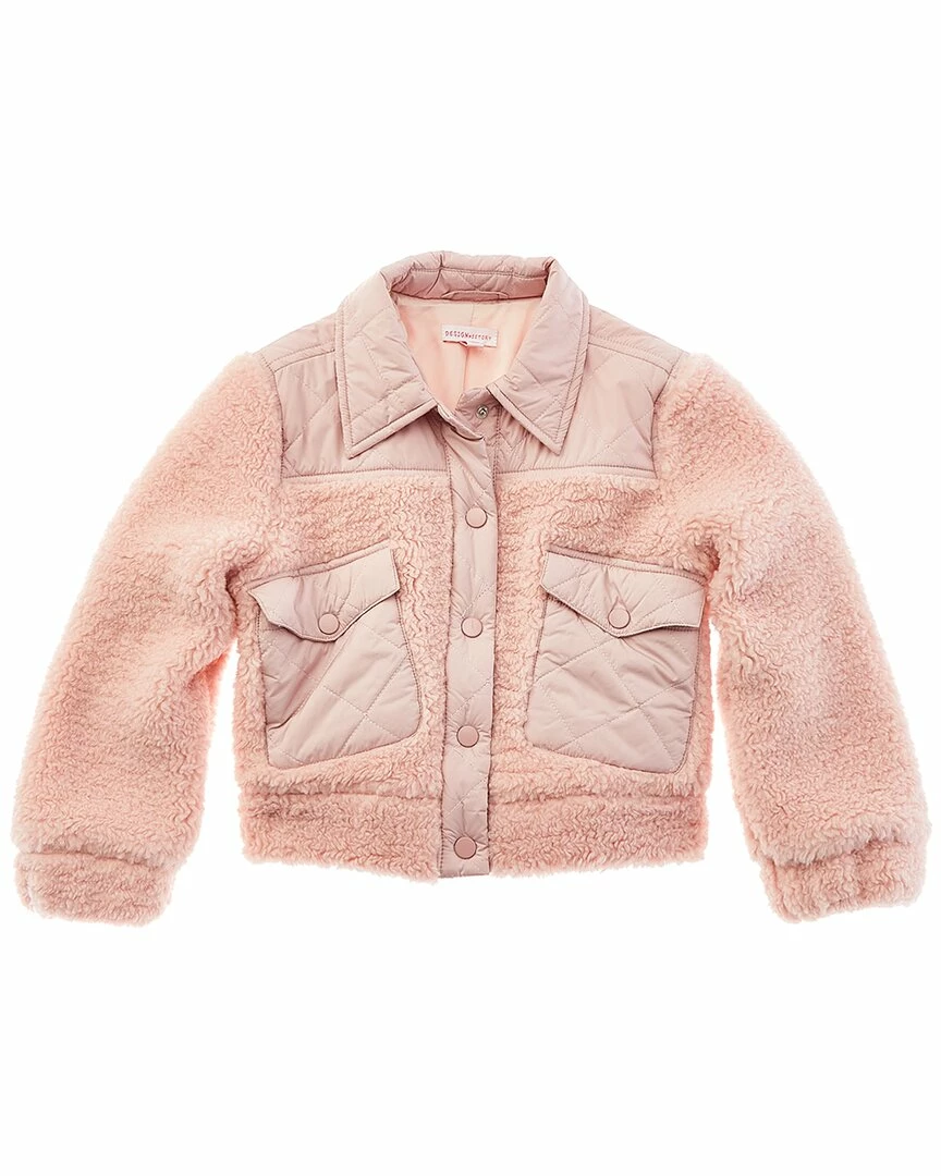 - Quilted Jacket In Dusty Pink With Sherpa Construction, Quilted Paneling, Spread Collar, Dual Chest Pockets And Strap Details At Back Hem