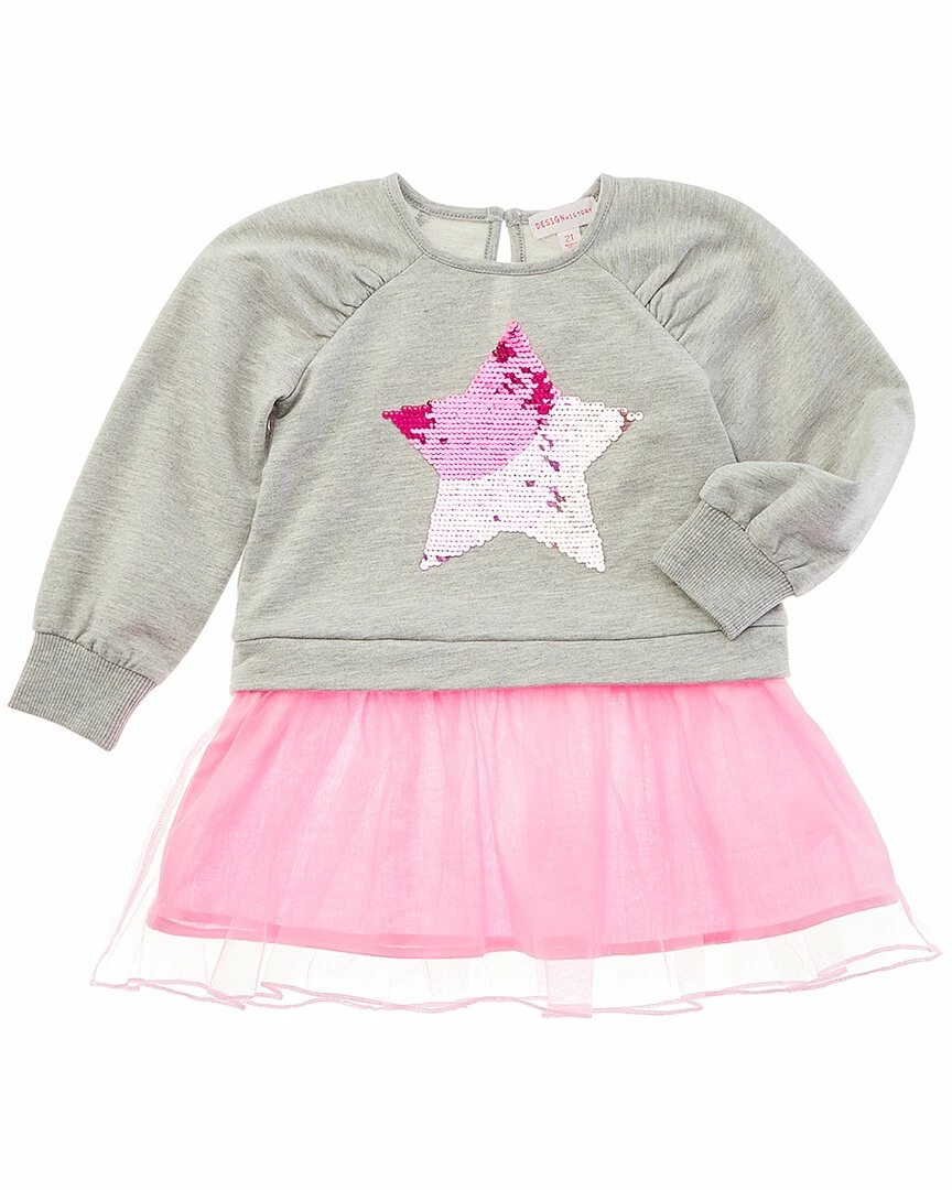 - Star Dress In Grey Heather Combo With Sequin-Embellished Star, Shirring Details And Tulle Skirt Overlay