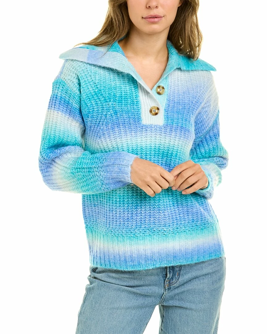 - 1/4-Button Sweater In Blue Combo With Oversized Collar, Dropped-Shoulder Sleeves And Ribbed Trim