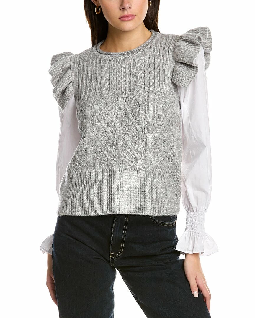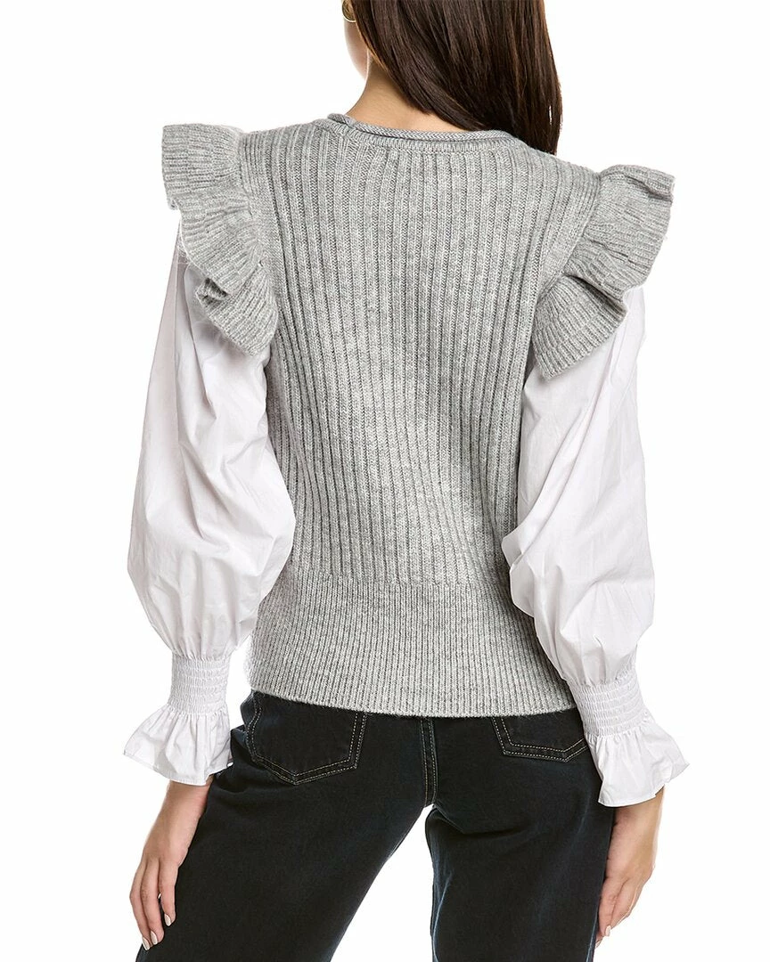 - Mixed Media Sweater In Oxford With Contrast Sleeves, Pleated Shoulders, And Smocked Cuffs