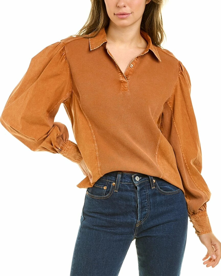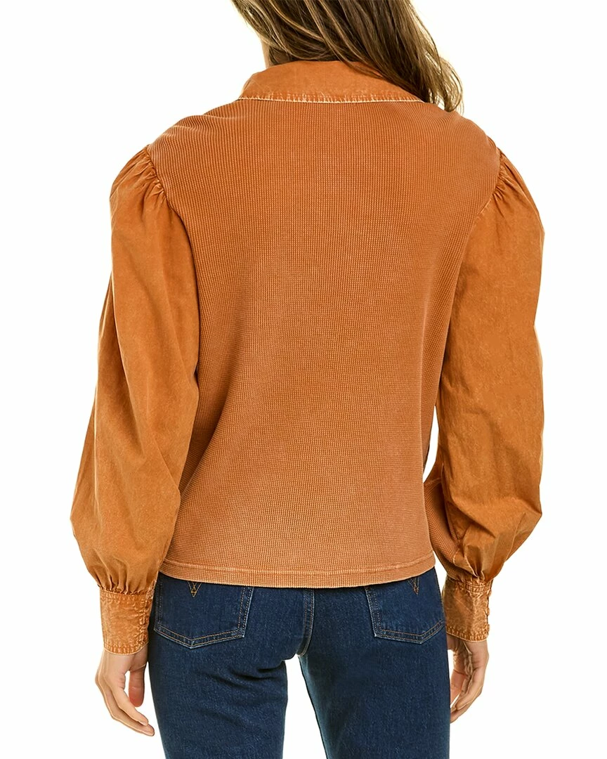 - Thermal Button Up Shirt In Orange Rust With Thermal Knit, Solid Contrast Paneling, Spread Collar, Shirred Sleeves And Button Cuffs